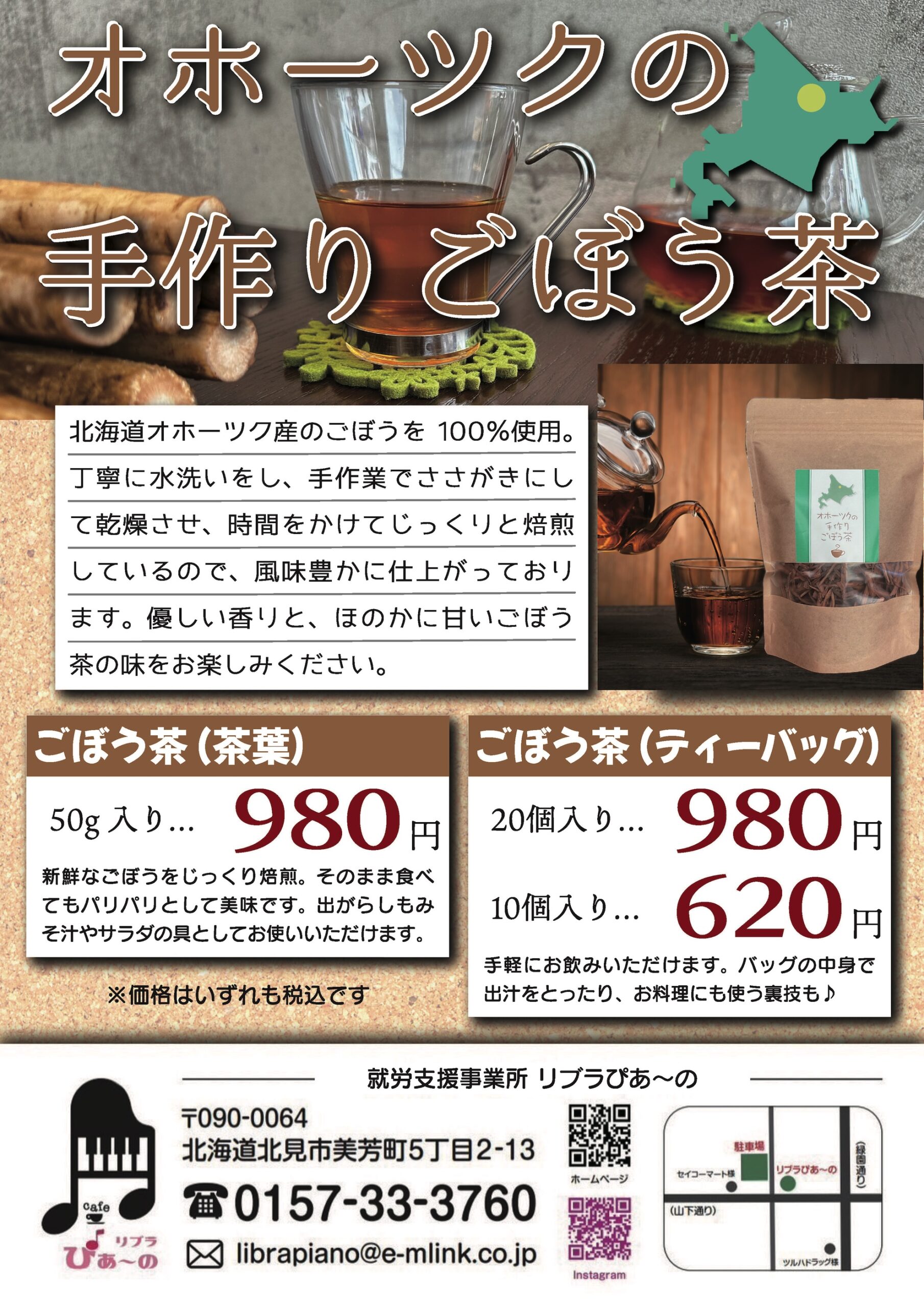 就労支援事業所「リブラぴあ〜の」が製造販売しているオホーツクの「手作りごぼう茶」がネットショップでも買えるようになりました。